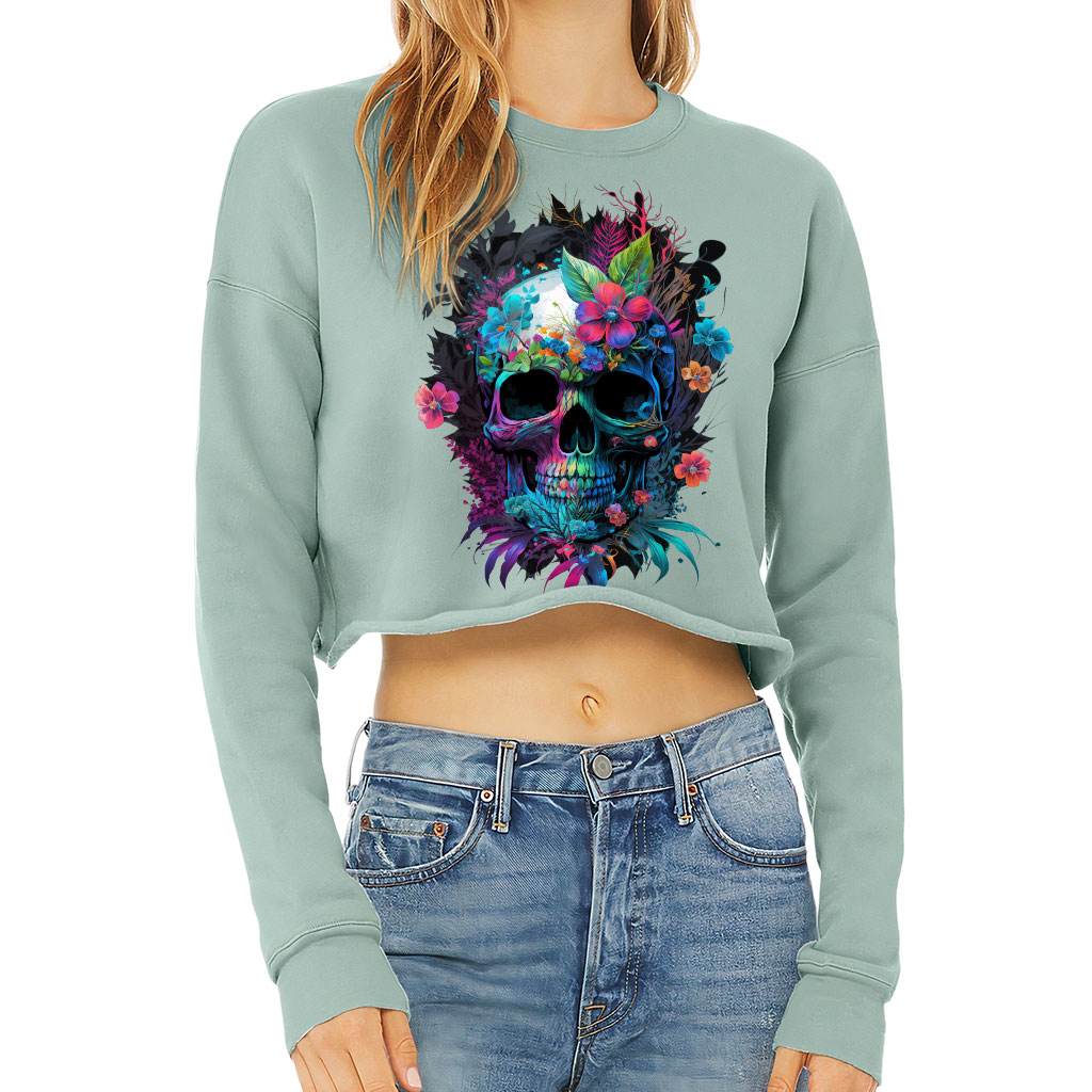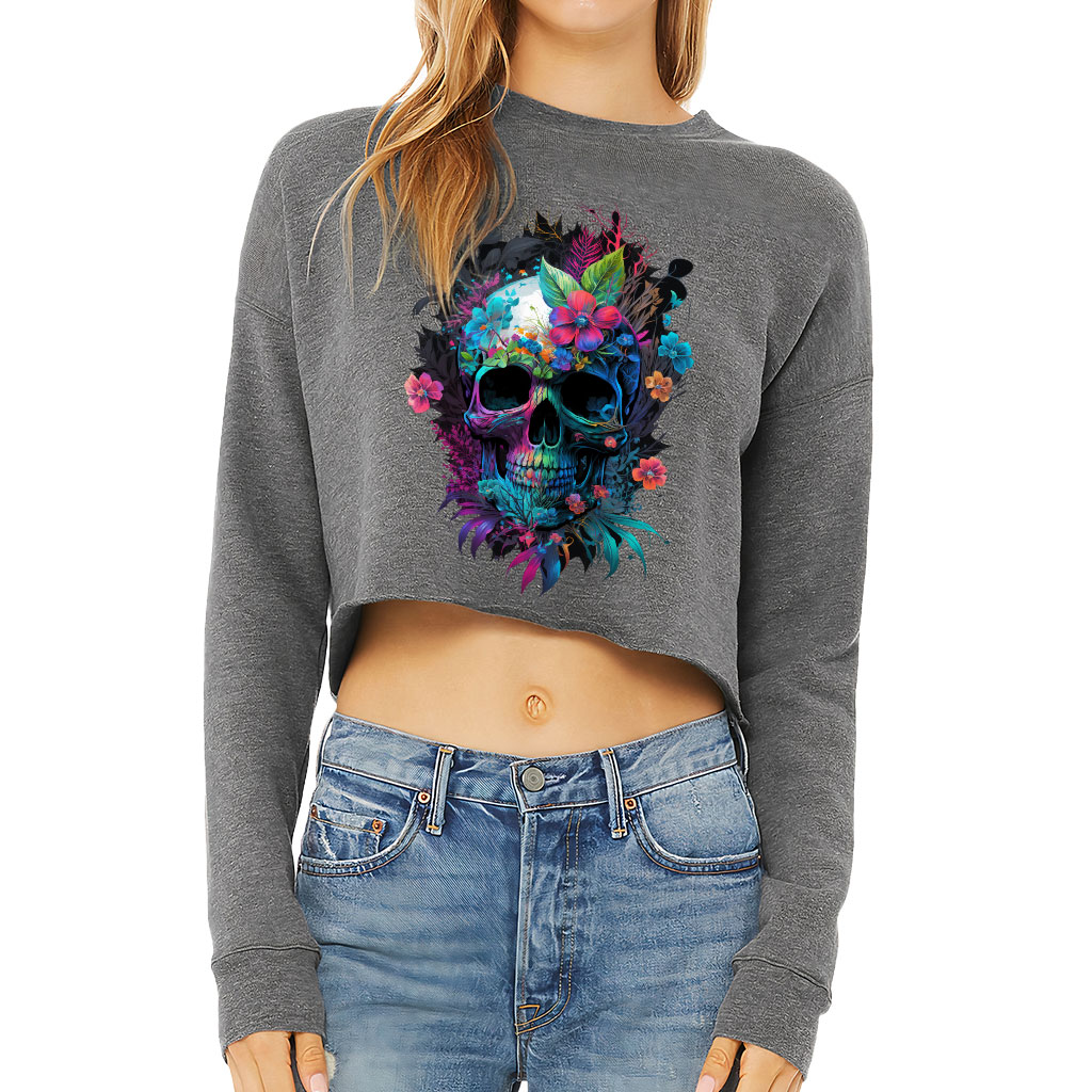 Cute Skull Cropped Sweatshirt – Flower Design Women’s Sweatshirt – Graphic Crop Crew Sweatshirt