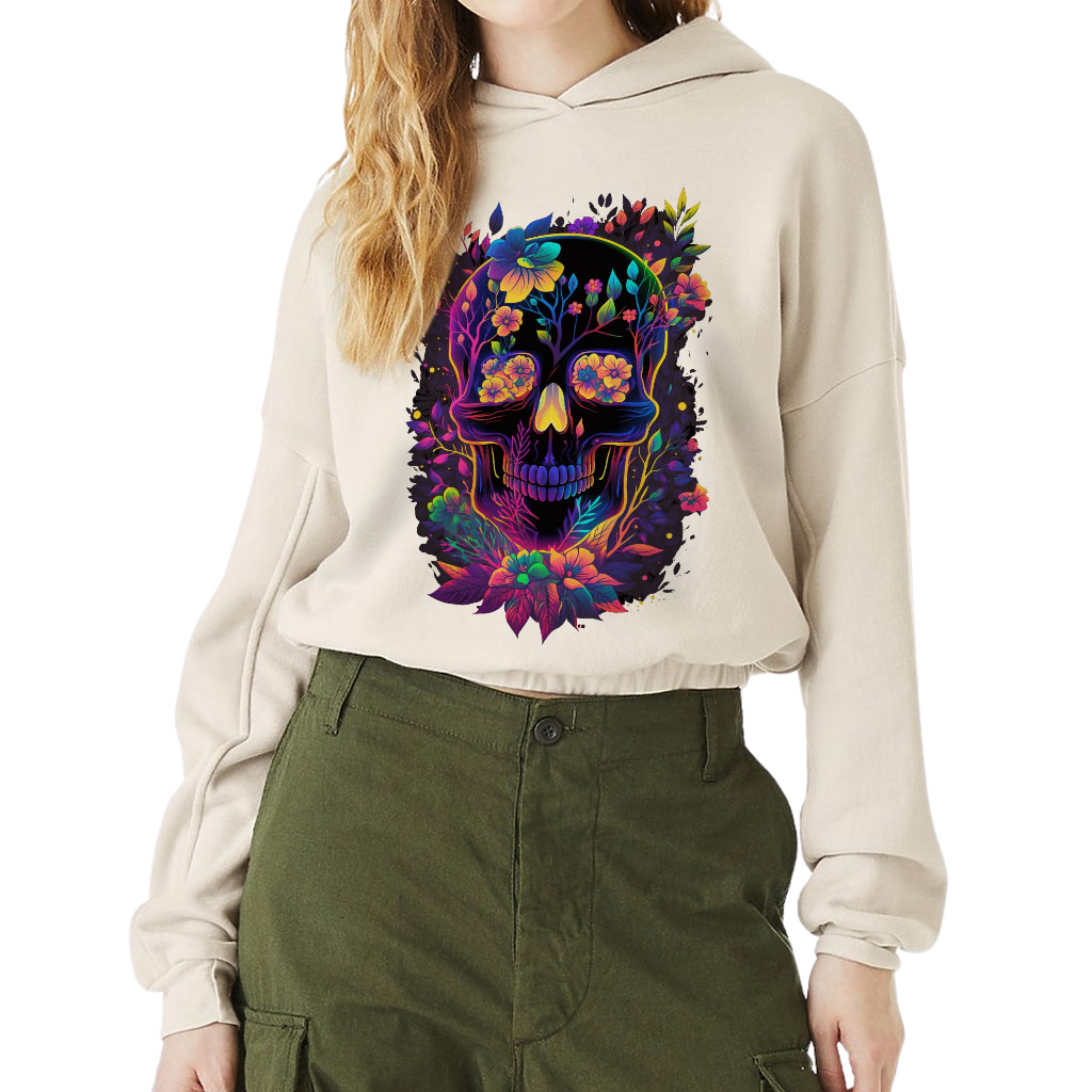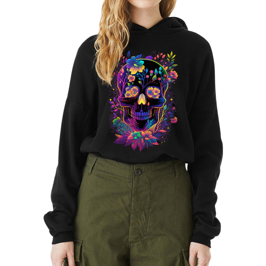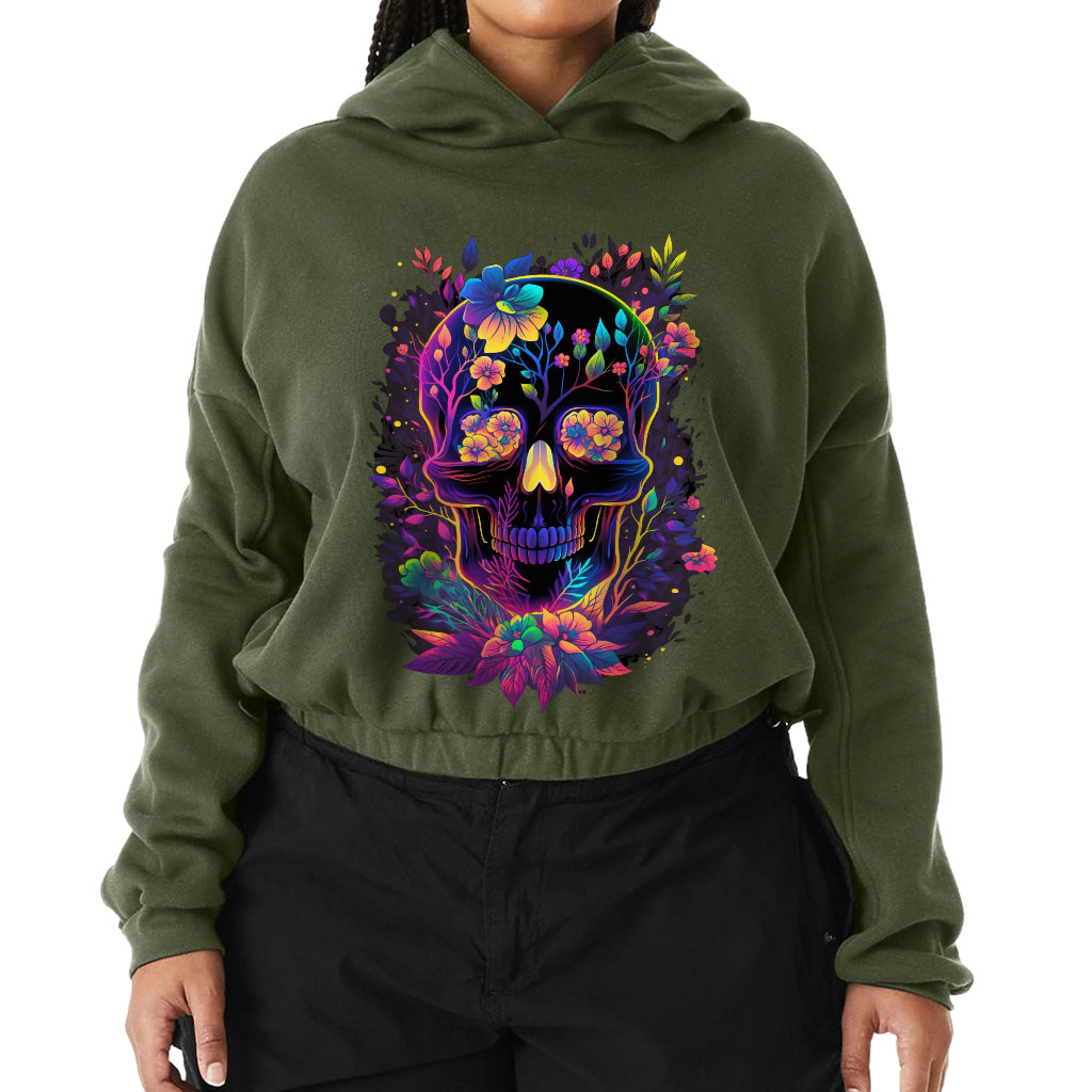 Flower Skull Cinched Bottom Hoodie – Neon Design Women’s Hoodie – Digital Art Hooded Sweatshirt