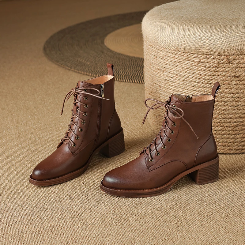 Genuine Leather Pointed Toe Chunky Heel Ankle Boots for Women