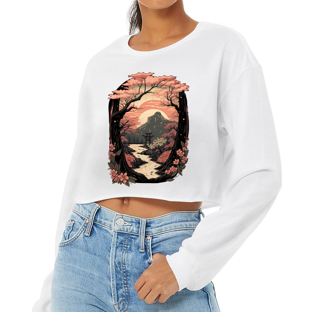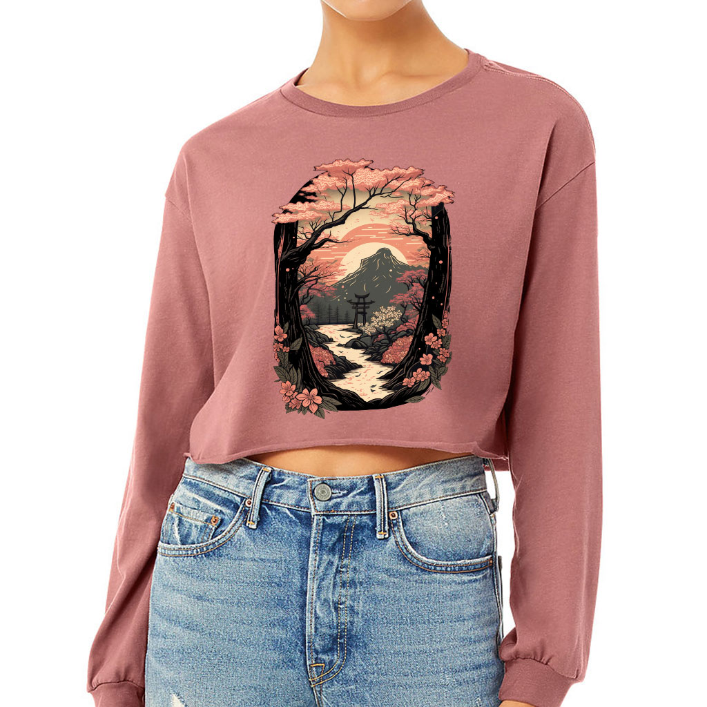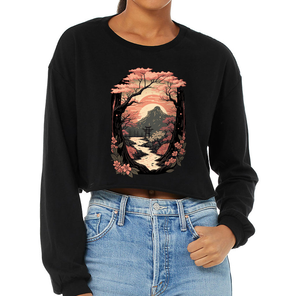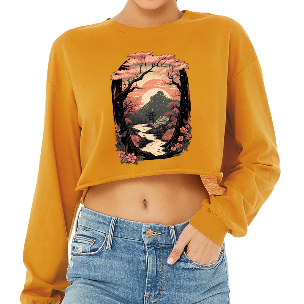Japanese Mountain Cropped Long Sleeve T-Shirt – Floral Women’s T-Shirt – Art Long Sleeve Tee