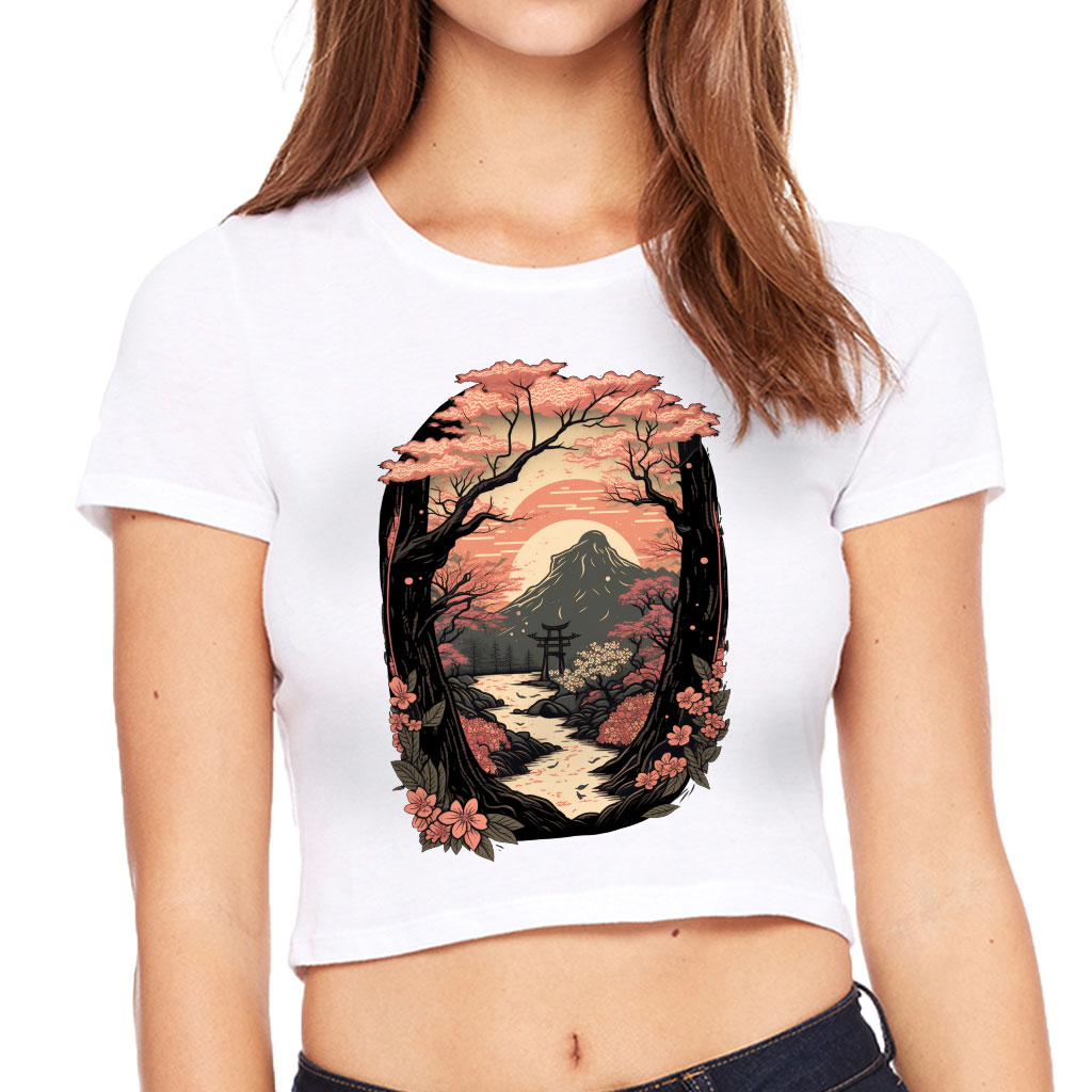 Japanese Mountain Women’s Cropped T-Shirt – Floral Crop Top – Art Cropped Tee