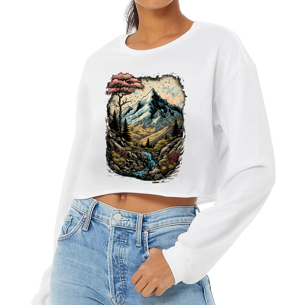 Mountain Print Cropped Long Sleeve T-Shirt – Nature Women’s T-Shirt – Beautiful Long Sleeve Tee