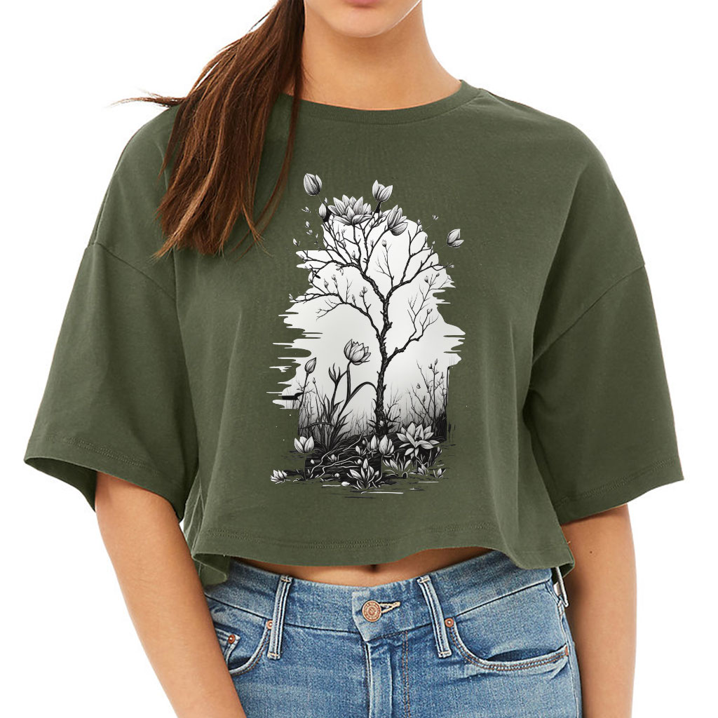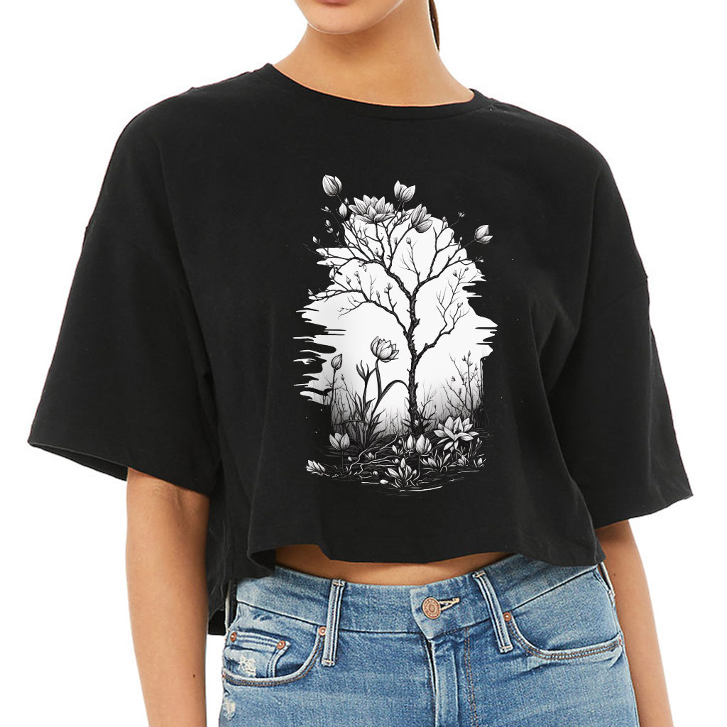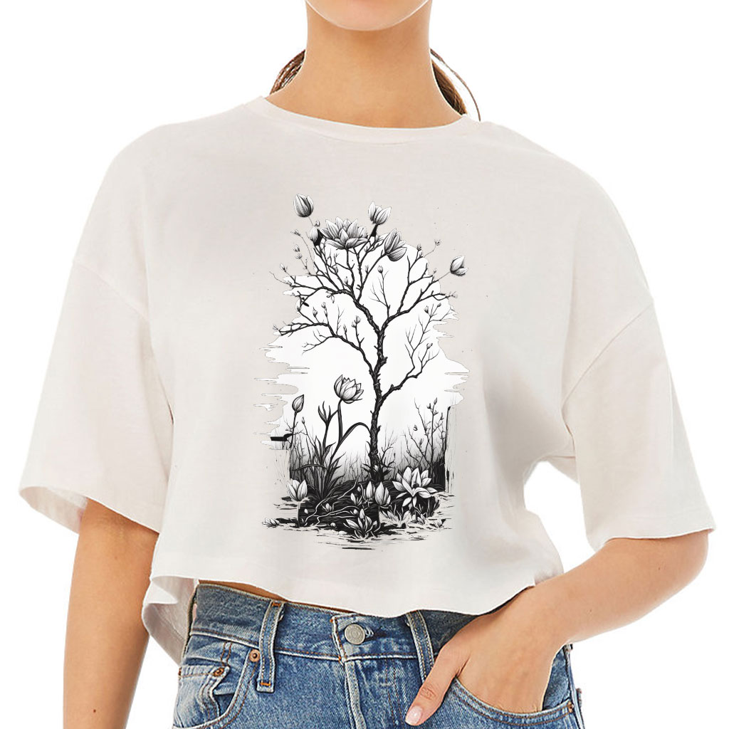 Nature Print Women’s Crop Tee Shirt – Flower Cropped T-Shirt – Graphic Crop Top