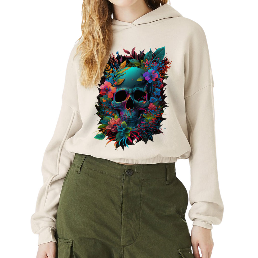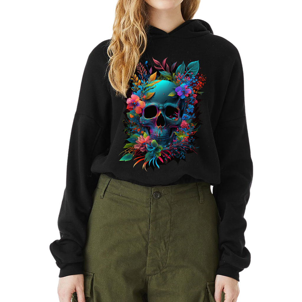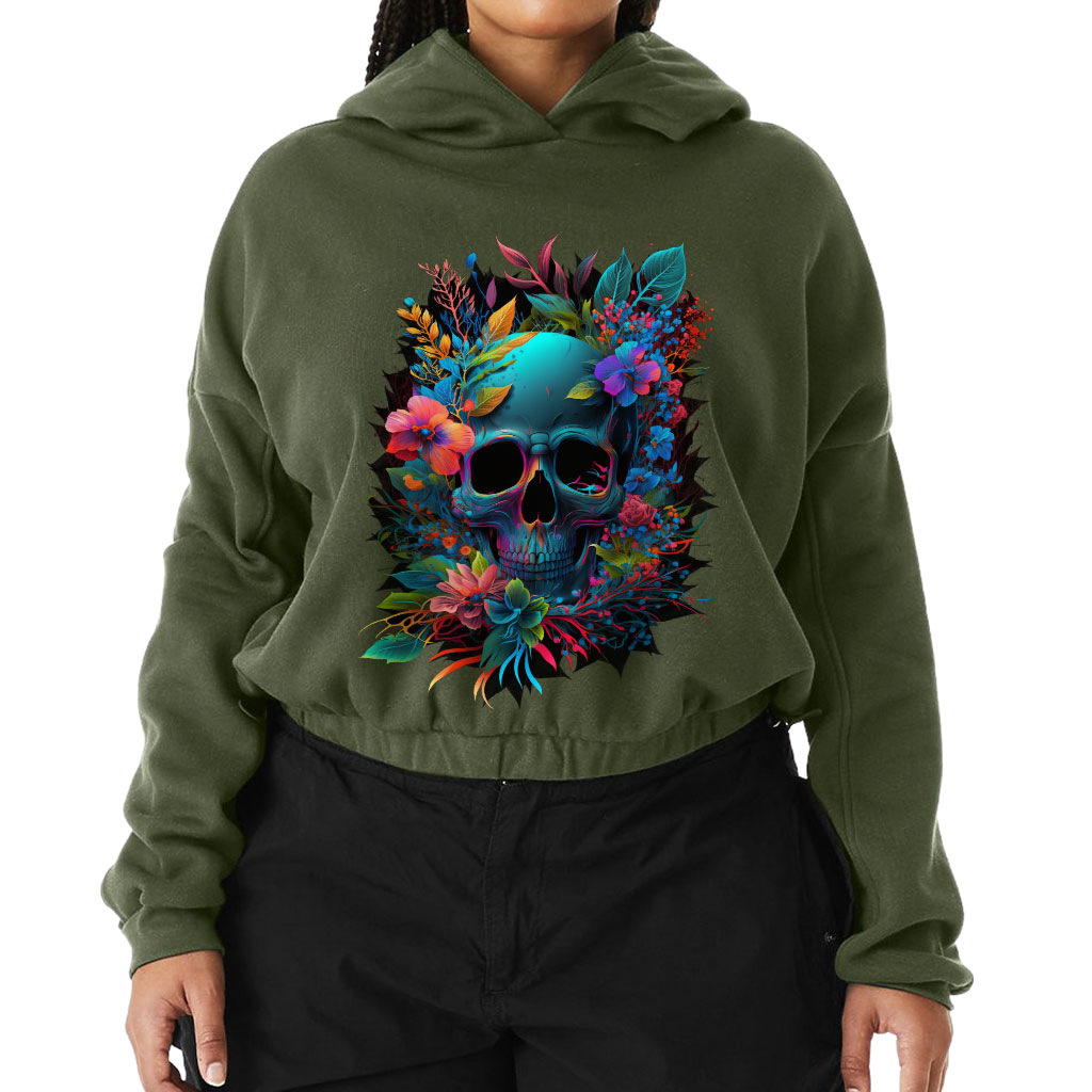 Skull Art Cinched Bottom Hoodie – Neon Print Women’s Hoodie – Themed Hooded Sweatshirt