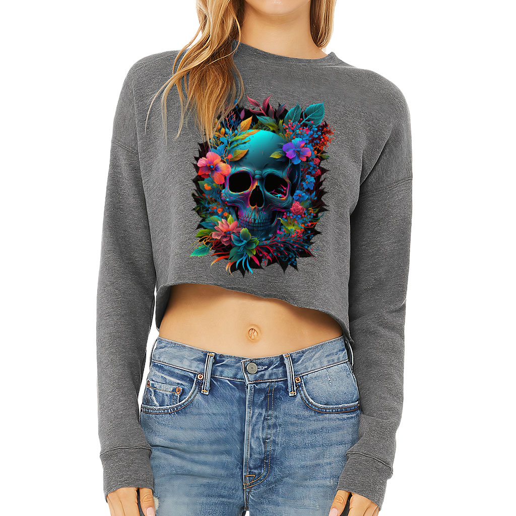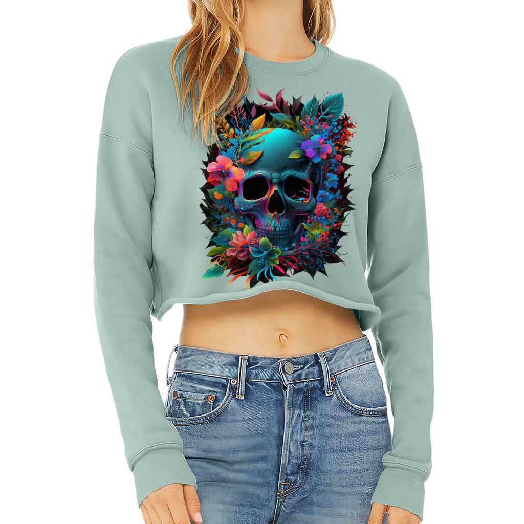 Skull Art Cropped Sweatshirt – Neon Print Women’s Sweatshirt – Themed Crop Crew Sweatshirt