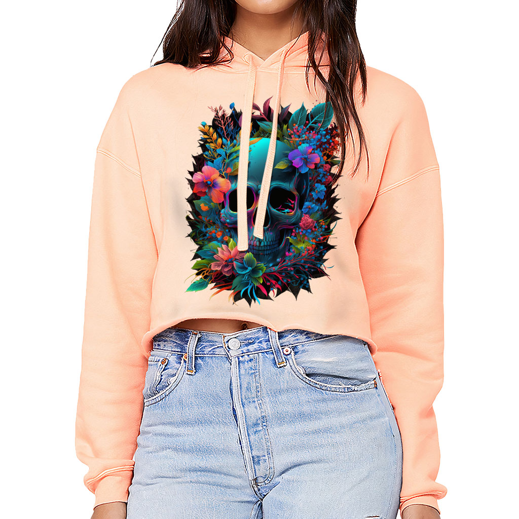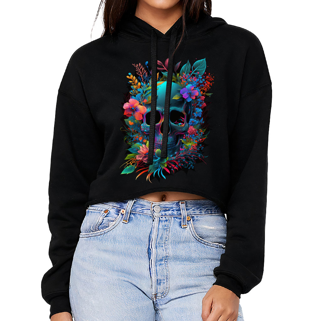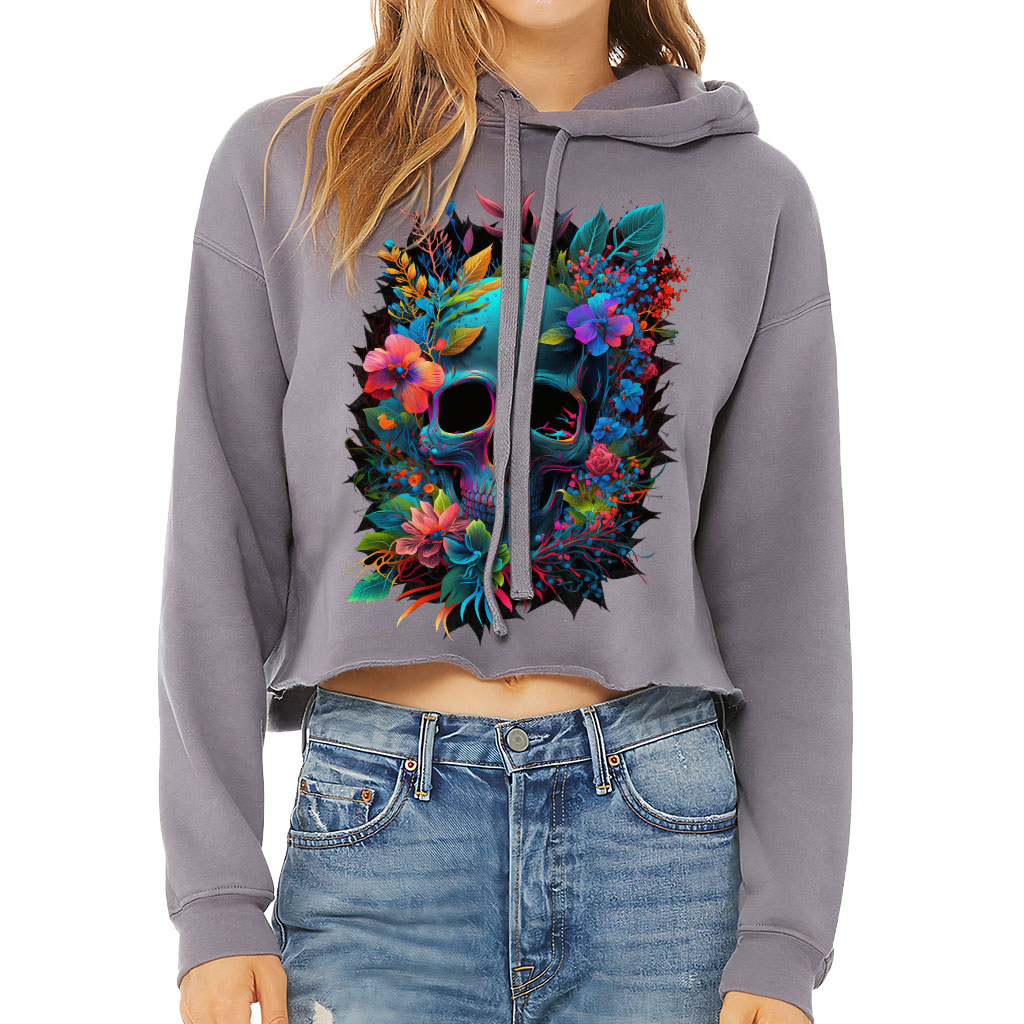 Skull Art Women’s Cropped Hoodie – Neon Print Cropped Hoodie – Themed Hooded Sweatshirt