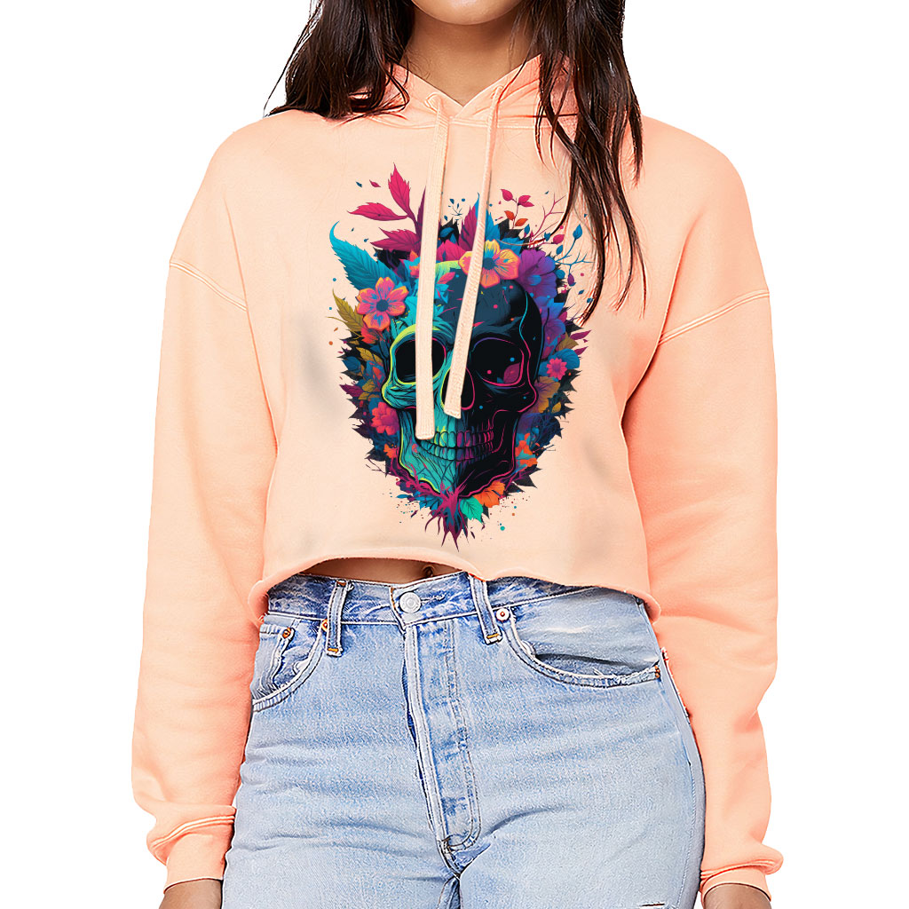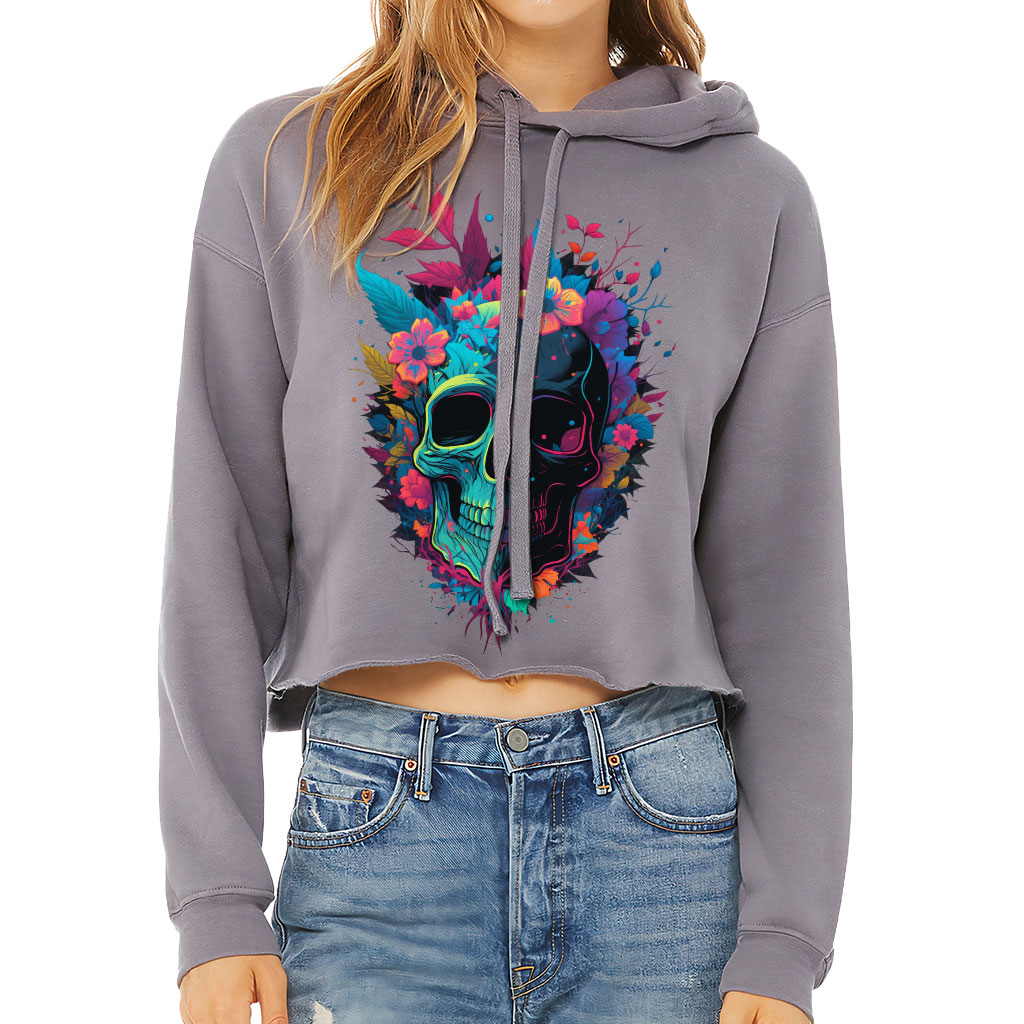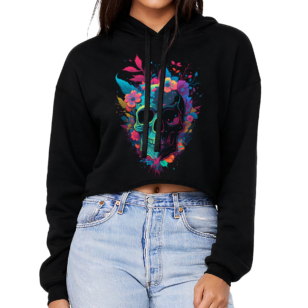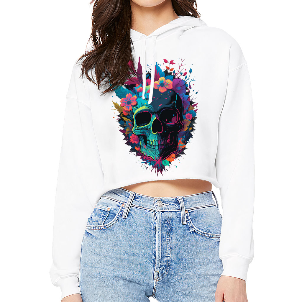 Skull Design Women’s Cropped Hoodie – Floral Print Cropped Hoodie – Artwork Hooded Sweatshirt