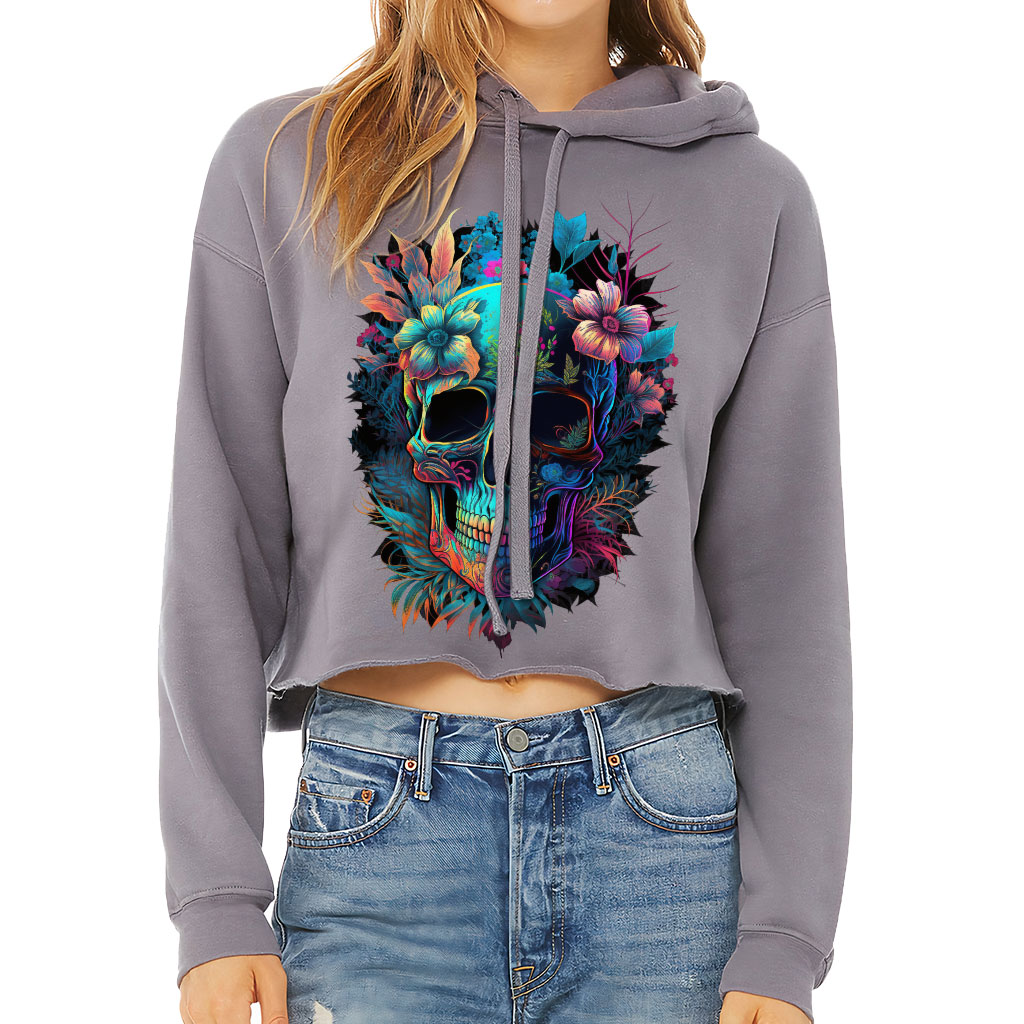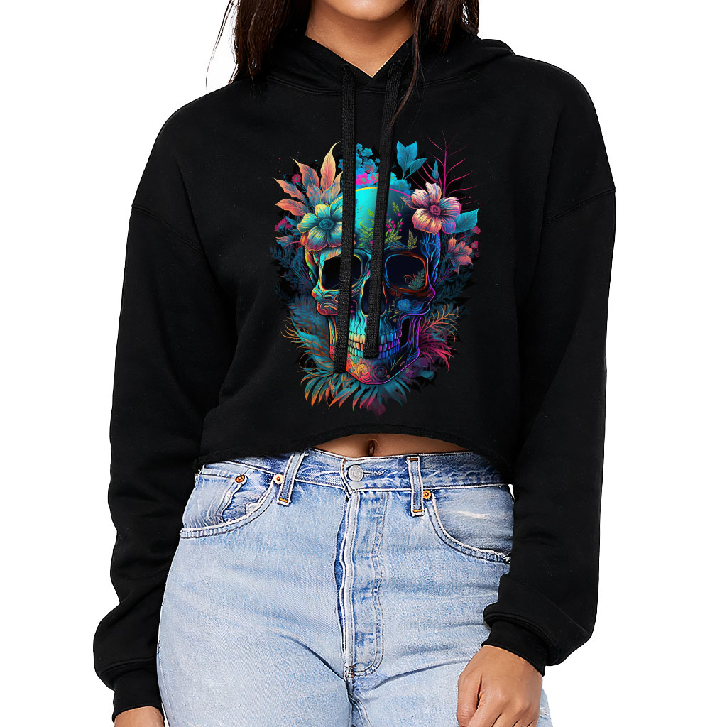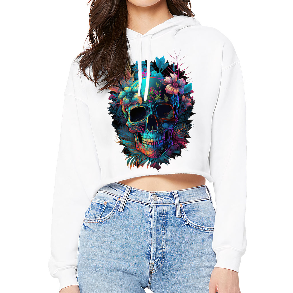 Skull Graphic Women’s Cropped Hoodie – Flower Cropped Hoodie – Illustration Hooded Sweatshirt