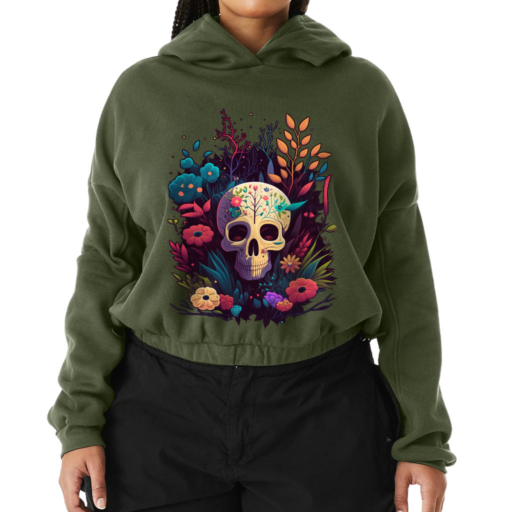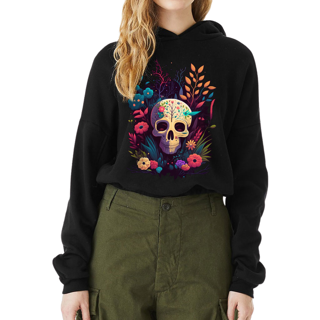 Skull Print Cinched Bottom Hoodie – Floral Design Women’s Hoodie – Printed Hooded Sweatshirt